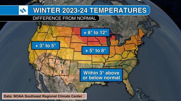 与正常情况相比,全国气温从南到北增加,从五大湖西部到达科他州东部的广大地区都经历了有记录以来最温暖的冬天。明尼苏达州最为突出,整个冬天该州大部分地区都比正常温度高10到12度。