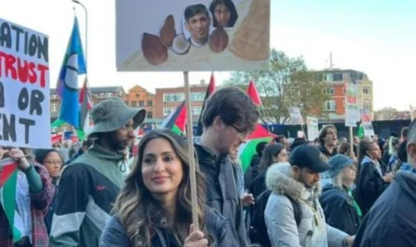 一名亲巴勒斯坦的教师在周六的和平游行中张贴了Rishi Sunak和Suella Braverman的种族主义海报,因此被大都会警察追捕。