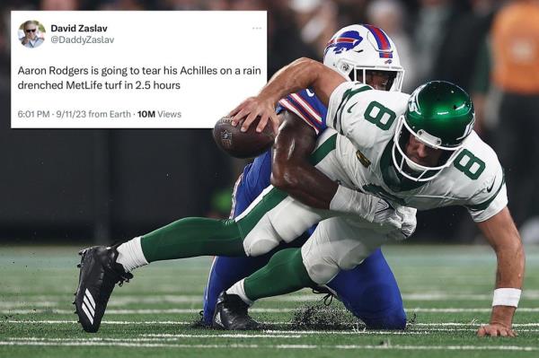 “亚龙·罗杰斯将在2.5小时后在淋雨的大都会人寿球场上撕裂他的跟腱,”用户@DaddyZaslav——一个恶搞华纳兄弟探索频道首席执行官大卫·扎斯拉夫的账号——在下午6点01分写道,大约两小时后,“周一足球之夜”将于晚上8点15分开球。