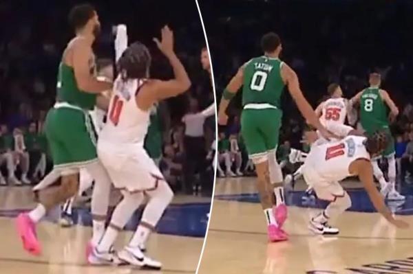 布伦森在三分投丢后倒地,但他似乎落在了凯尔特人球星杰森·塔图姆的脚上,塔图姆完成了技术罚球。
