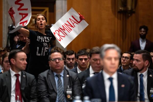 星期二,在参议院外交关系委员会举行的听证会上,美国国务卿安东尼·布林肯敦促美国国务院为2025财年制定600亿美元的预算,仇视以色列的抗议者在听证会上多次爆发,称他是“加沙的屠夫”。