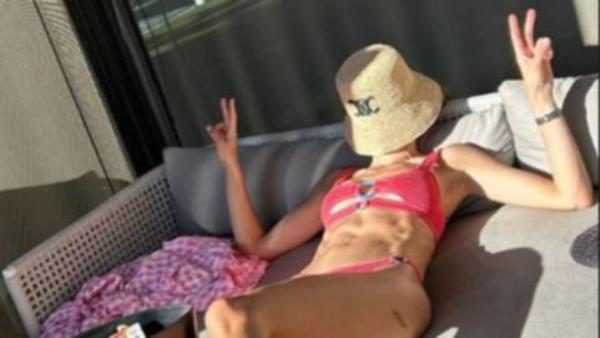 贝克还晒出了一张她穿着粉色比基尼晒日光浴的照片,展示了她健美的腹部。