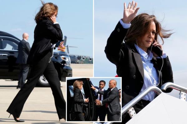 59岁的哈里斯回头看了一眼,向飞机台阶附近拥挤的记者挥手,然后又在坡道顶部停下来调整耳机,同时把手机举到左耳旁。