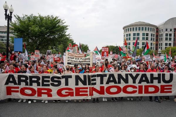 人群举着巴勒斯坦旗帜和标语,从左翼口号到圣经经文,他们聚集在国会大厦附近,呼吁停火,并逮捕内塔尼亚胡,检察官正在向国际刑事法院申请对他的逮捕令。
