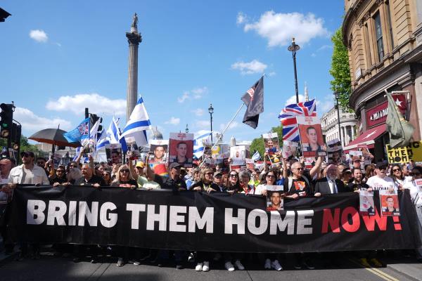 周日,数千人从霍尔本的林肯酒店出发,游行到白厅的里士满露台,要求立即释放在加沙被扣押的人质。