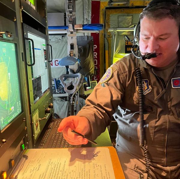 Hogue是飞机的装填员,他检查信息是否干净。他把数据传给该任务的空中侦察气象官,也就是飞行气象学家克里斯·戴克少校(major . Chris Dyke),戴克少校坐在几英尺外的一台特殊电脑前,分析由投下式探空仪和其他飞机传感器收集的信息,然后将其传送给迈阿密的国家飓风中心(National Hurricane Center)。