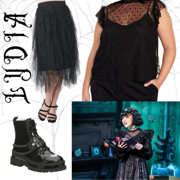 莉迪亚的衣橱是所有哥特青少年的梦想成真。所以,对于Lydia Broadway Bound来说,任何黑色上衣都可以配上透明的网眼领口,下摆一条古怪的薄纱裙,再配上一双你能找到的最笨重、最大胆的战斗靴。但要小心:当你经过的时候,人们可能会喊“Beetlejuice, Beetlejuice, Beetlejuice!”