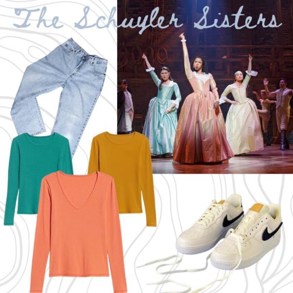 对于三个朋友来说,你所需要的是颜色协调的上衣,成为汉密尔顿的斯凯勒姐妹!伊丽莎穿的是蓝绿色,安吉莉卡穿的是桃红色,佩吉穿的是春天的黄色:上衣搭配你最喜欢的休闲装,你就可以在任何派对上寻找其他的工作头脑了(如果佩吉选择在她的套装中穿一点红色,玛丽亚·雷莫兹当然不会介意)。