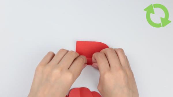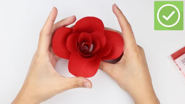 把花瓣以开放的方式粘在一起,分层。取另一个同样大小的正方形,在角上涂上热熔胶。然后,把花蕾拿在另一只手上,把花瓣粘在花蕾上。因为你还在第二层花瓣上,这一层也会高度弯曲,靠近花蕾。当你展开花瓣的时候,花瓣会越来越散开。每一层都应该从层之间露出来。在山谷里