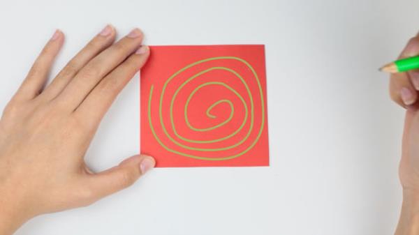 在纸上画一个螺旋。用铅笔从正方形纸的外缘开始轻轻地画一个螺旋形。然后简单地徒手画一个螺旋——线之间的空间越大,花瓣就会越厚。就是这么简单。它不需要是完美的、统一的,甚至不需要以任何方式。不平衡,不平衡
