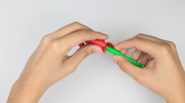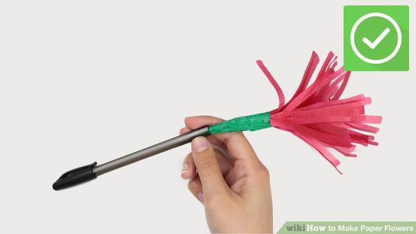 在你做了花之后,用花胶带把它包在胶带上。花胶带是绿色的,看起来更像茎。然后你可以把胶带的一端贴在任何东西上,不管是卡片还是笔头。如果你的花看起来还是缺了点什么,试着在花冠上缠上丝带