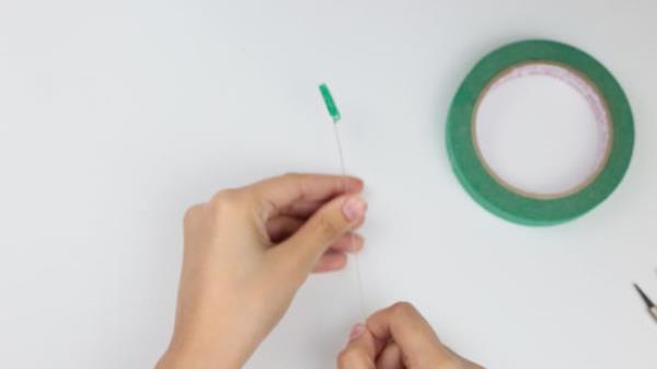 取一小段花线,在顶部弯曲。在环上缠上一块胶带