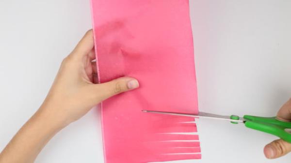 在长条上剪出垂直的线条,保持一英寸左右不动。沿着这条往下走,每隔一段时间在纸巾上剪一小段。如果你想要小花瓣,把剪子剪得紧贴在一起;如果你想要更大的花瓣,把它们分开得更远。在试纸条的一端保持一英寸左右的纸巾不动。这将是花的一部分,你工作和使用你的ba