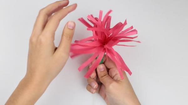 一旦胶带上了,把你的“花瓣”弄蓬松,让它们看起来更花。把它们摊开,压扁一点,让它们像康乃馨一样伸展开来。