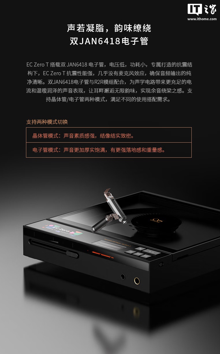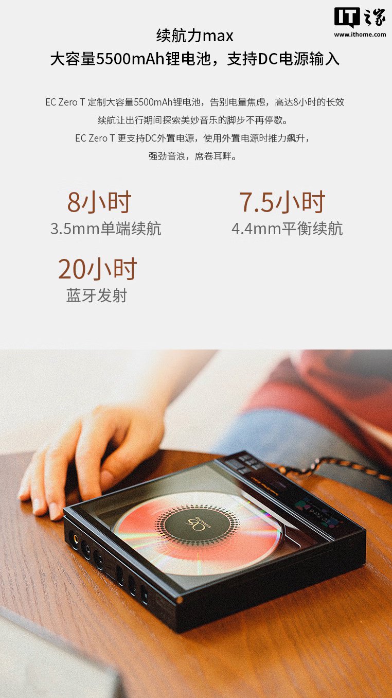在硬件配置方面,EC Zero T搭载了定制电机和自研昆仑24bit RDR DAC架构。双JAN648电子管设计支持晶体管和电子管两种工作模式,配合TPA620A2运放,能够带来更丰富的音色表现。内置5500毫安时大容量电池,在3.5mm单端输出模式下可提供长达8小时的续航时间。