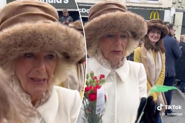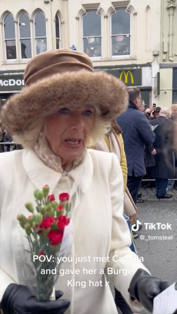 在英国科尔切斯特,英国女王卡米拉与国王查尔斯三世公开访问时,一名女子递给她一顶汉堡王皇冠,这一事件在网上疯传。