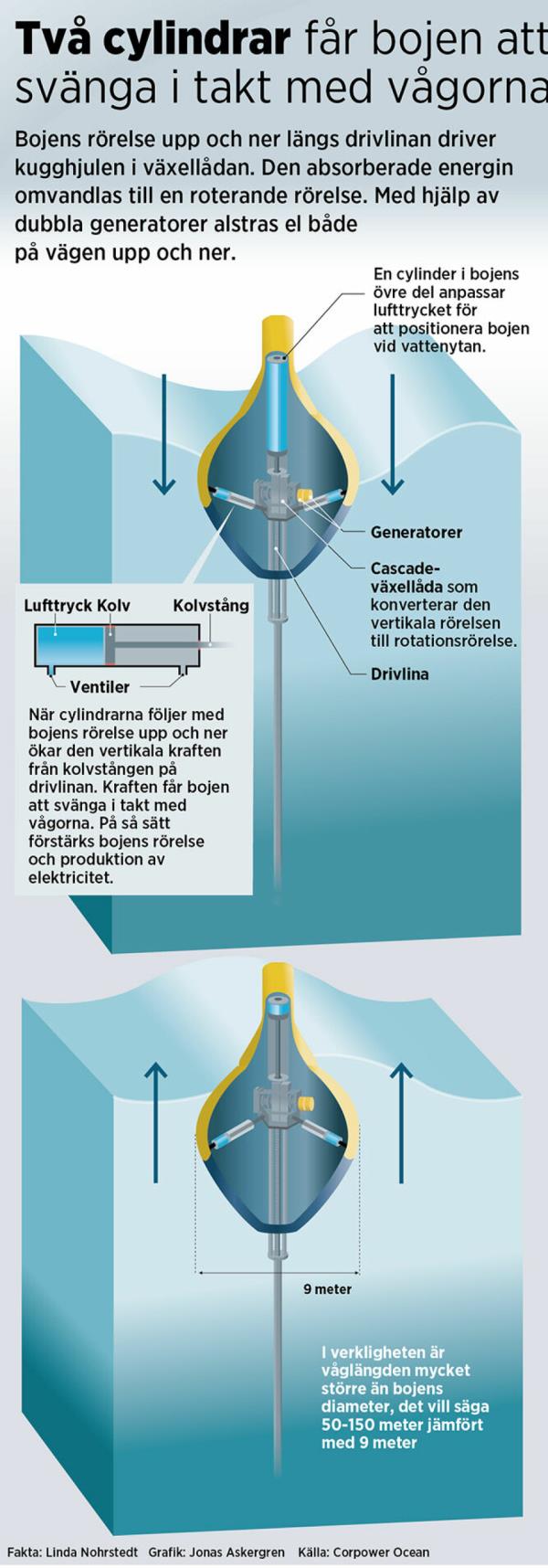 波浪动力浮标高18米,直径9米。在8月份的安装过程中,一艘较小的拖船将其拖出大海。在那里,它被固定在45米深的海底的一个锚上,用机械和电子快速接头连接起来。从那时起,技术人员进入浮标进行检查和小型操作。这表明该技术可以以安全和灵活的方式进行维修和维护。