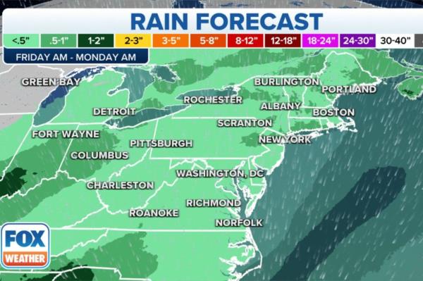 到周五,降雨将扩展到东南部大部分地区,新奥尔良和纳什维尔可能会下雨。