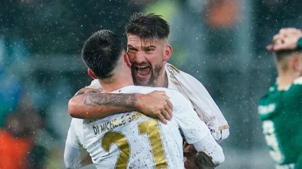 终场哨响后,来自萨尔布尔 cken的凯·布尔(右)与来自萨尔布尔 cken的法比奥·迪·米歇尔·桑切斯一起庆祝。