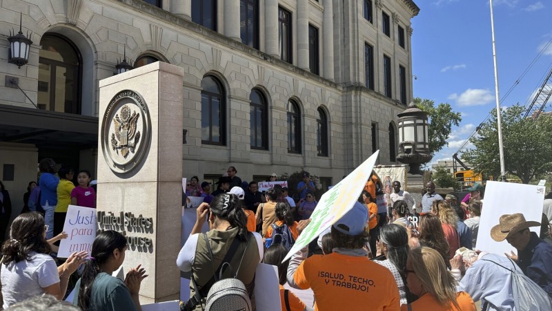 在听证会外,100多人举着标语,听着西班牙语和英语的简短演讲,反对这项新法律,呼吁人们互相关心。