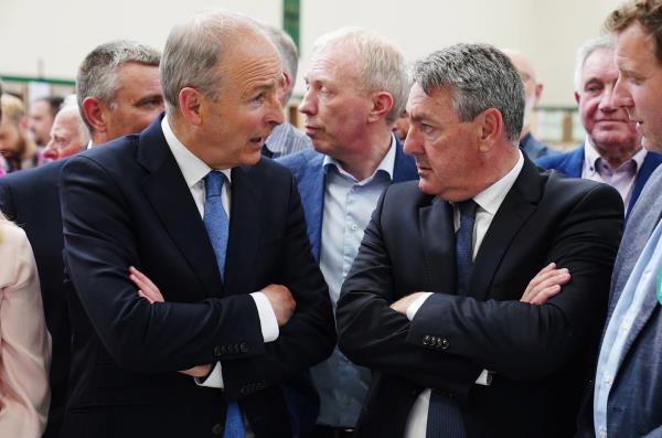 共和党Fáil的比利·凯莱赫(右)与Tánaiste和党领袖Micheál·马丁等待第18次欧洲议会选举的计票结果。摄影:Brian Lawless/PA Wire