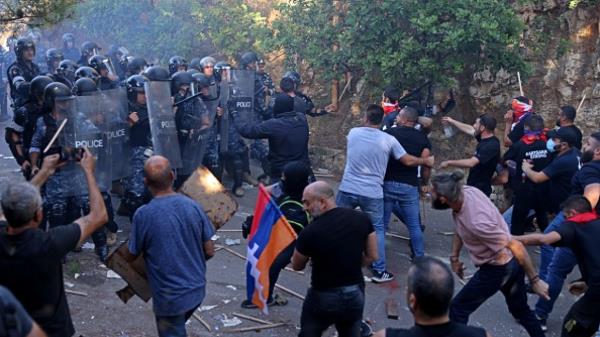 黎巴嫩亚美尼亚人星期四在阿塞拜疆驻黎巴嫩大使馆外的抗议活动中与安全部队发生冲突。上周,巴库闪电进攻,夺回了长期存在争议的纳戈尔诺-卡拉巴赫地区。
