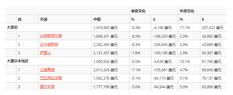 达尔文、堪培拉和霍巴特表现最差的地区在3%至4%之间,而悉尼和墨尔本表现最差的郊区下降了5.5%至8.5%。