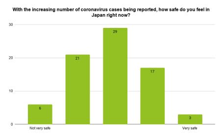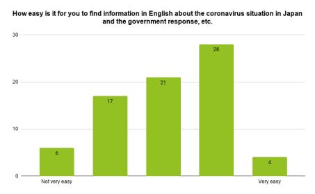 由于日本许多新闻机构也有英文版本的出版物,居民似乎能够找到有关日本冠状病毒情况的英文新闻。大多数受访者写道,NHK等网站是他们目前的主要新闻来源。少数居民还提到,他们能够通过Facebook或其他社交媒体与社区保持联系,从某种意义上说,他们能够通过自己家的安全判断公众的反应。