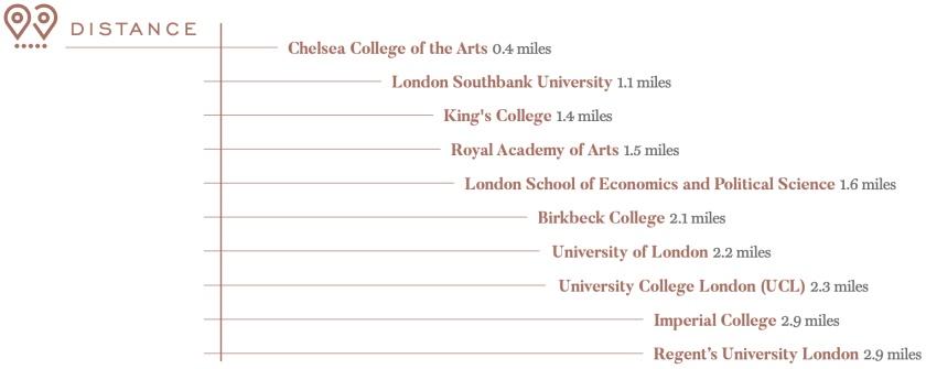 项目享有精品的贵族教育资源,三英里步行圈内,坐落有举世闻名的伦敦政治经济学院LSE、国王学院KCL、伦敦大学学院UCL和帝国理工学院IC,此外还有切尔西学院、皇家艺术学院等高端艺术院校。