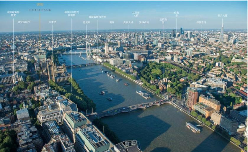 密尔河岸九号位于此区腹地,坐落于泰晤士河北岸,东边就是深受游客喜欢的白金汉宫、威斯敏斯特大教堂、英国国会大厦、 威斯敏斯教堂和大本钟。