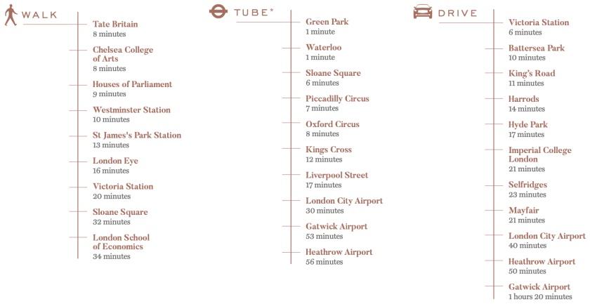 项目步行至威斯敏斯特地铁站 Westminster Station仅需12分钟,此站交汇着黄线Circle Line、绿线District Line和灰线Jubilee Line,可谓是四通八达,住户去往各大地标都非常便捷。去往绿园 Green Park仅需1分钟,滑铁卢1分钟,牛津街8分钟,国王十字 King's Cross 12分钟,利物浦街 Liverpool Street 17分钟,希思罗机场 Heathrow Airport:地铁56分钟。