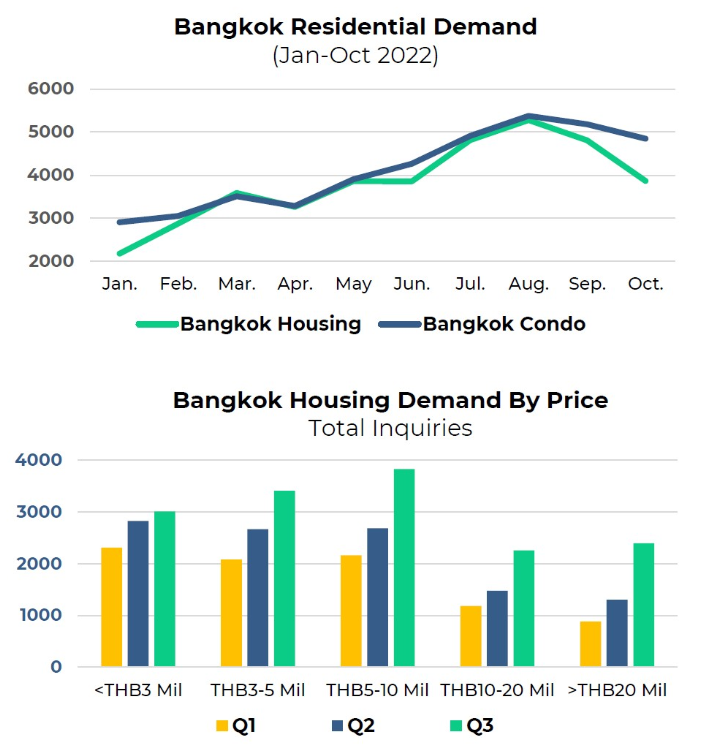 将公寓单元与泰国首都住宅的需求进行比较时,在2022年的大部分时间里,这一水平大致保持不变。这包括国内和海外需求。然而,公寓需求在9月和10月明显优于住房,这与外国对曼谷公寓的兴趣激增有关。