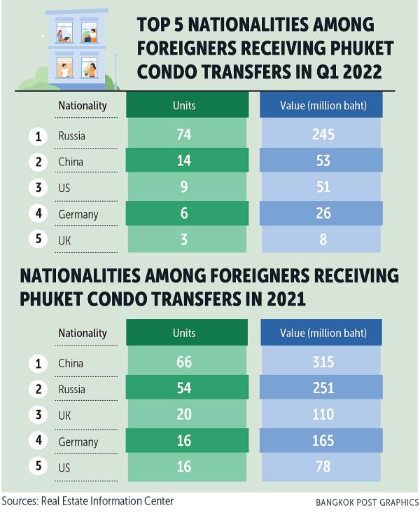 根据房地产信息中心的数据,俄罗斯人是2022年第一季度在普吉岛转让公寓最多的国家,有74套公寓,价值2.45亿泰铢。