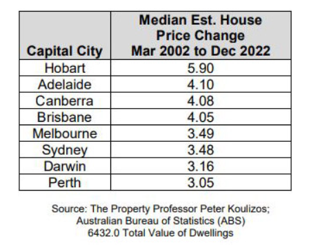 Koulizos先生分析了澳大利亚统计局(ABS)从2002年3月到2022年12月的成屋转让中位数价格,他说结果可能会让很多房地产专家感到惊讶。