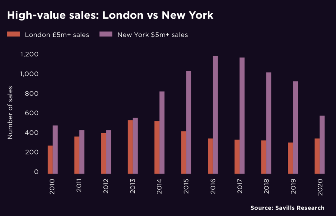 同时,相比纽约,英国伦敦的房产市场恢复的更快。超过500万英镑的房产交易量比2019年增长了12%,而2020年纽约在该价格阶段的销售额同比下降了37%。