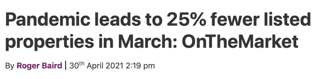OnTheMarket的数据显示,相比12个月之前,2021年3月英格兰和威尔士可出售的房产减少了25%。这种短缺现象在英国西南部等连续封锁地区最为严重。