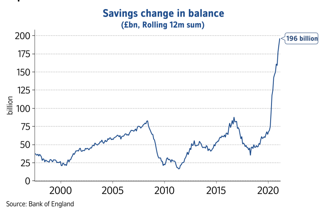 数据显示,在截至2021年2月的12个月内,英国家庭存款增长了1960亿英镑,平均每户家庭增加了7000英镑,几乎是去年同期的三倍。