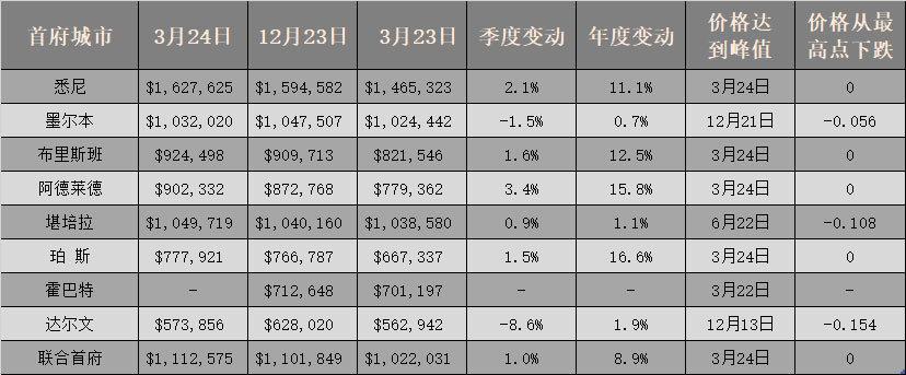 - 布里斯班、阿德莱德和珀斯的公寓价格同样创下了历史新高(表2);