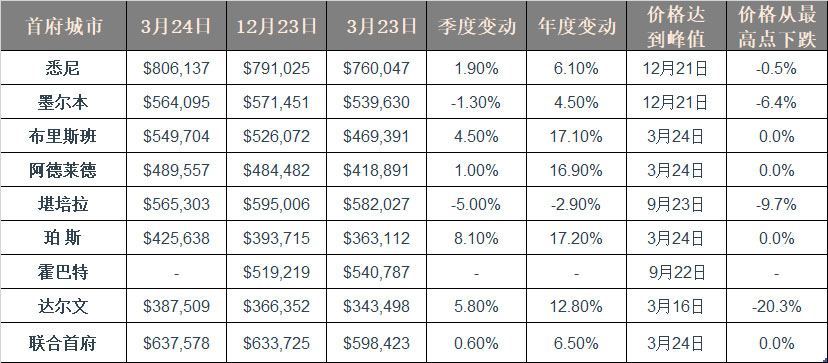 - 悉尼、布里斯班、阿德莱德和珀斯的房屋价格达到新的历史高点(表1);