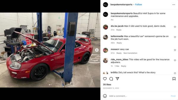 格鲁伯补充说,在撞车前,他一直跟着这辆Supra大约五分钟,据称在此期间,司机一直遵守交通法规。他还证实,司机是一名试驾汽车的机械师。虽然格鲁伯不知道据称雇用该司机的公司的名称,但当地汽车集团指出,超速商店Bespoke Motorsports是处理这辆车的公司。在最后一天被删除之前,该店在Instagram上发布的最新消息是一辆红色Supra,其发动机舱、车轮和贴纸与失事汽车的相符。