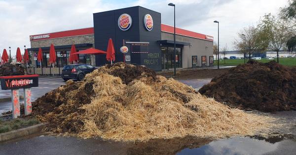 在周五的“打拳行动”中,Haute-Sa?ne的150名农民在维苏尔的麦当劳和汉堡王快餐连锁店前倾倒粪便。Haute-Sa?ne的部门农民工会联合会(FDSEA)在其Facebook页面上发表声明,谴责该部门的一个牲畜农场正在“死亡”,而“快餐店正在填饱肚子”。这次行动的目的是谴责这样一个事实,根据工会的说法,这些快餐巨头没有采购足够的法国肉。