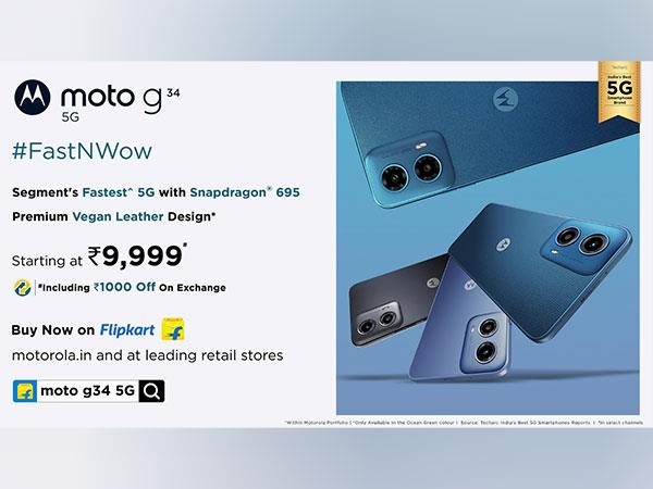 1月17日,印度新德里:印度最好的5G智能手机品牌摩托罗拉(Motorola)最近在其价格合理的g系列产品中增加了moto g34 5G,这是该领域最快的5G性能。moto g34 5G今天中午12点开始在摩托罗拉的Flipkart上发售。在印度领先的零售店,售价仅为9999卢比。