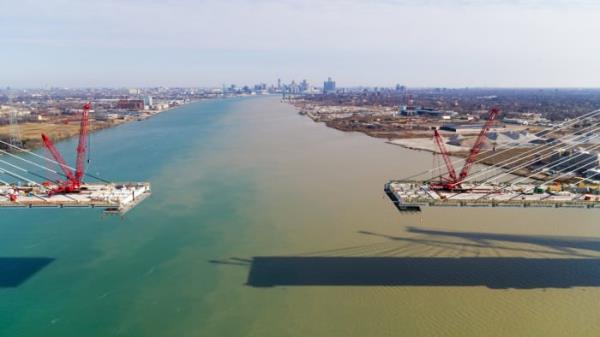 上面的照片显示,两个桥面,一个在底特律河的加拿大一侧,另一个在美国一侧,几乎准备好在中间连接起来。下面是成品的效果图。