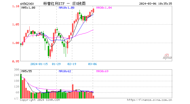 高股息热门标的——标普红利ETF(562030)低开高走,场内价格上涨0.46%,冲击日线4连阳。值得注意的是,标普红利ETF(562060)今日盘中上探1.094元,续刷上市以来新高(2023.12.28以来)。