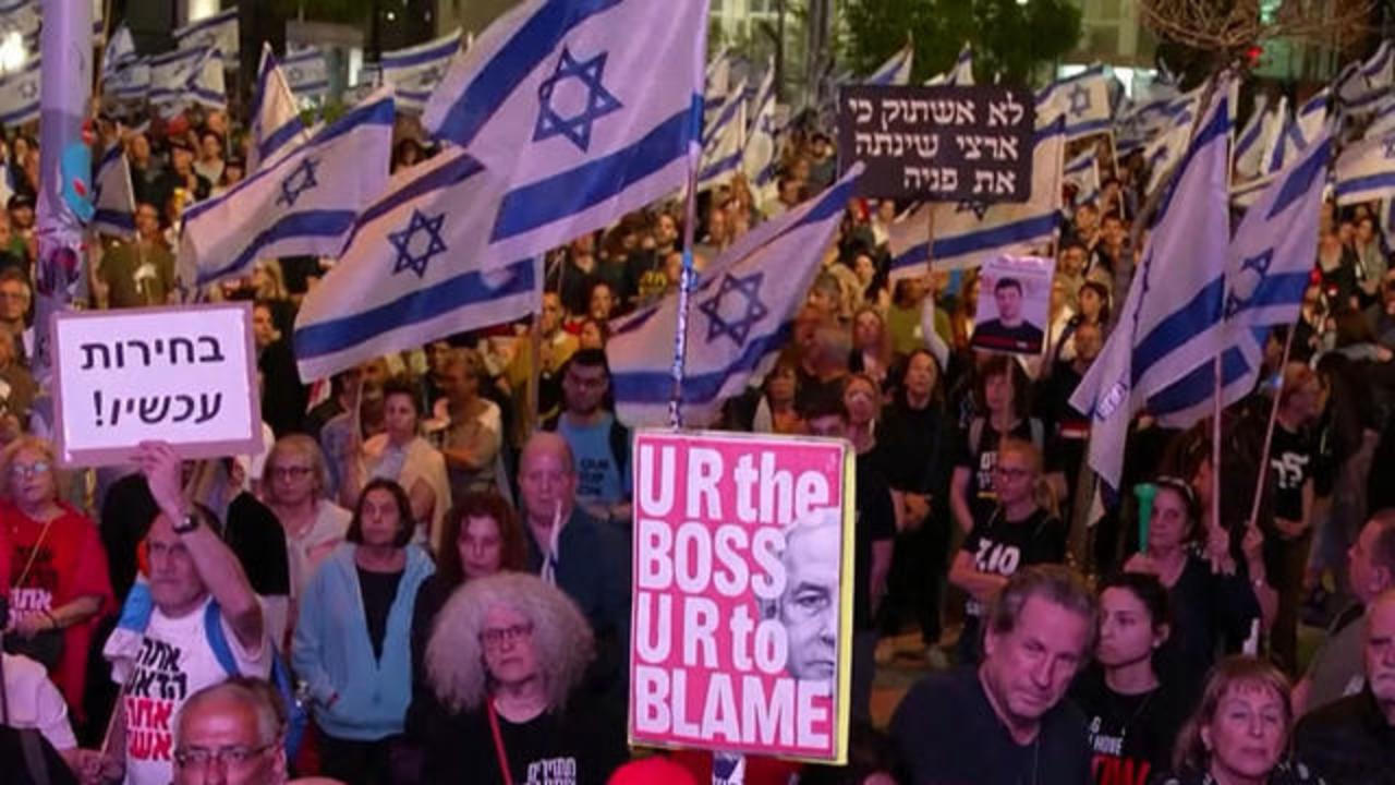 抗议者指责内塔尼亚胡应对10月7日的失败负责,并表示,去年他试图进行的司法改革引发的深刻政治分歧削弱了以色列在袭击发生前的实力。一些人指责他破坏了与以色列最重要的盟友美国的关系。