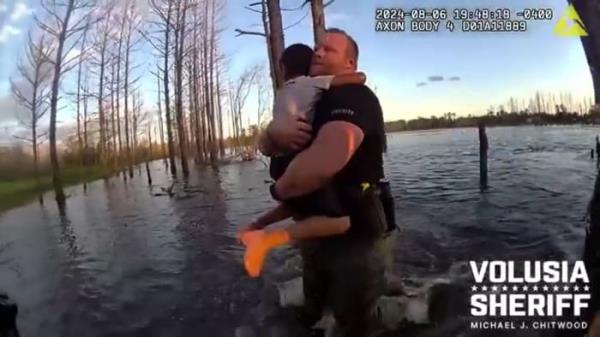 佛罗里达州沃卢西亚县沃卢西亚县警长办公室公布的随身摄像头显示,周二晚上,一名副警长从德尔托纳的一个池塘里救出了一名儿童。