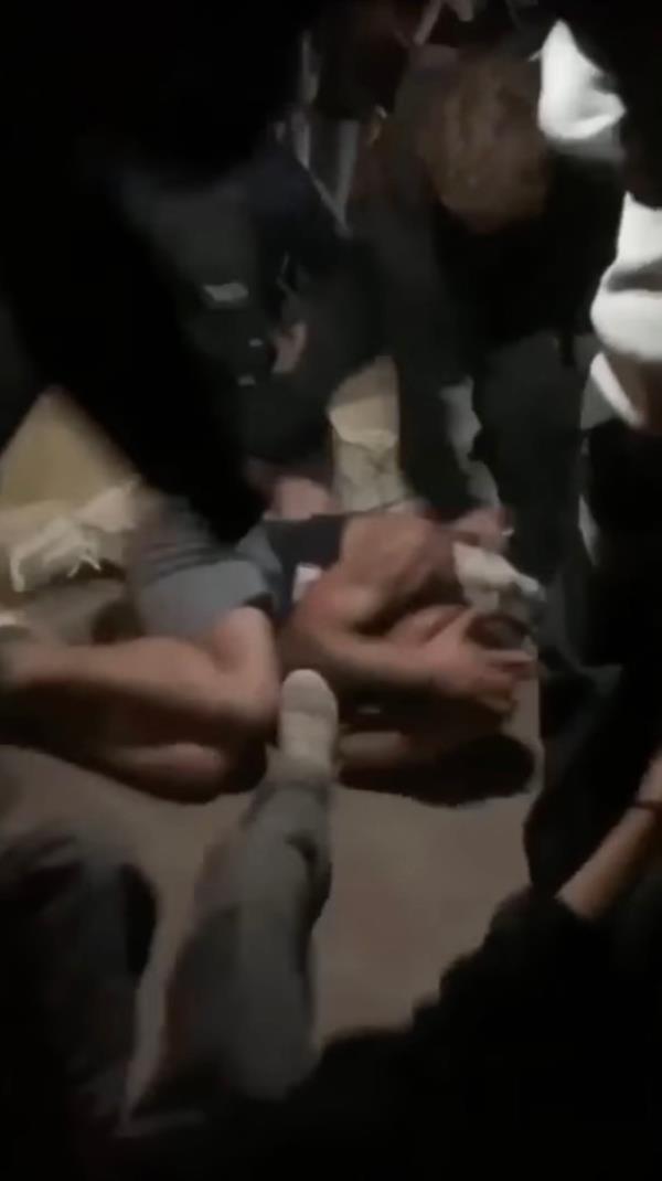 人群做出反应,对士兵拳打脚踢,士兵们跪倒在地,像胎儿一样蹲在地上,人群的拳打脚踢像雨点般落在他们身上。