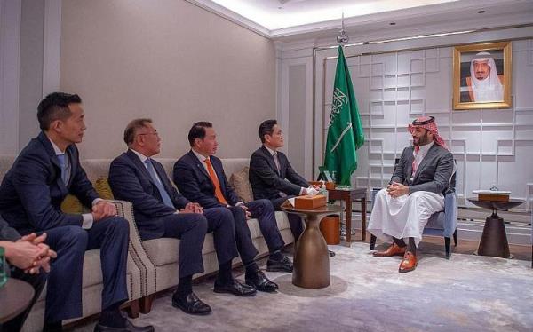 沙特王储穆罕默德·本·萨勒曼(右)正在与韩国企业进行会谈这是2022年11月在首尔乐天酒店的房间里拍摄的大企业集团领导层的照片。从左至右依次为:韩华集团副会长金东官、现代汽车集团常务会长郑义宣、SK集团会长崔泰源、三星电子三星电子执行会长李在镕。截图来自沙特通讯社网站