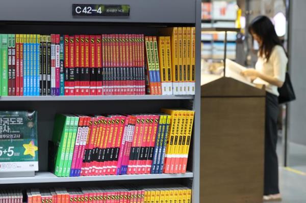 一位顾客在书架旁快速浏览一本书6月23日,在汉城一家书店里摆放着为初次就业而准备的就业手册。韩国联合通讯社