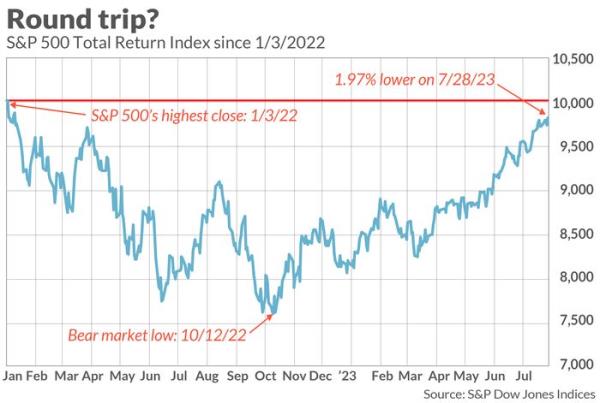 标准普尔500指数(S&P 500 SPX)即将从2022年的熊市损失中完全复苏,这一点有多乐观?股息再投资的基准美国股指(总回报率)仅比2022年1月的历史高点低2.0%。即使股市一周表现平平,也可能将这一基准推高。